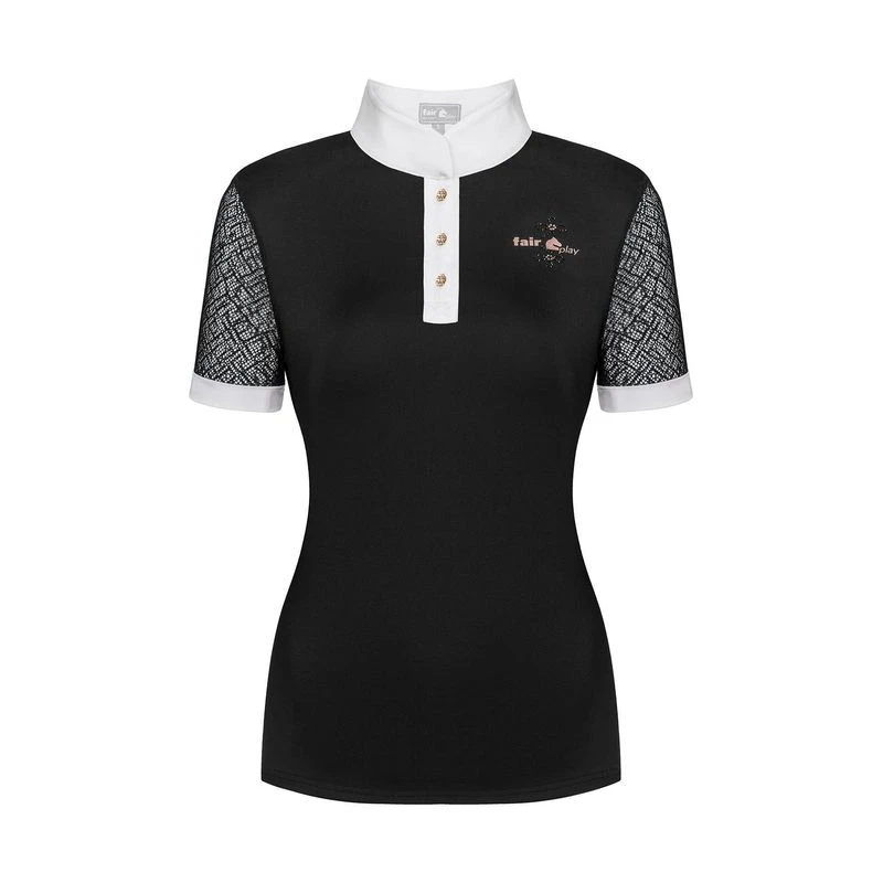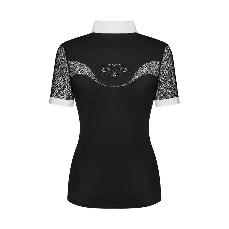 This short sleeve competition shirt is made of stretchy, breathable, and moisture wicking technical fabric. The sleeves and back inserts are mesh for increased airflow. The tab collar and placket are secured with decorative rose gold buttons and the back features a rose gold jet design.