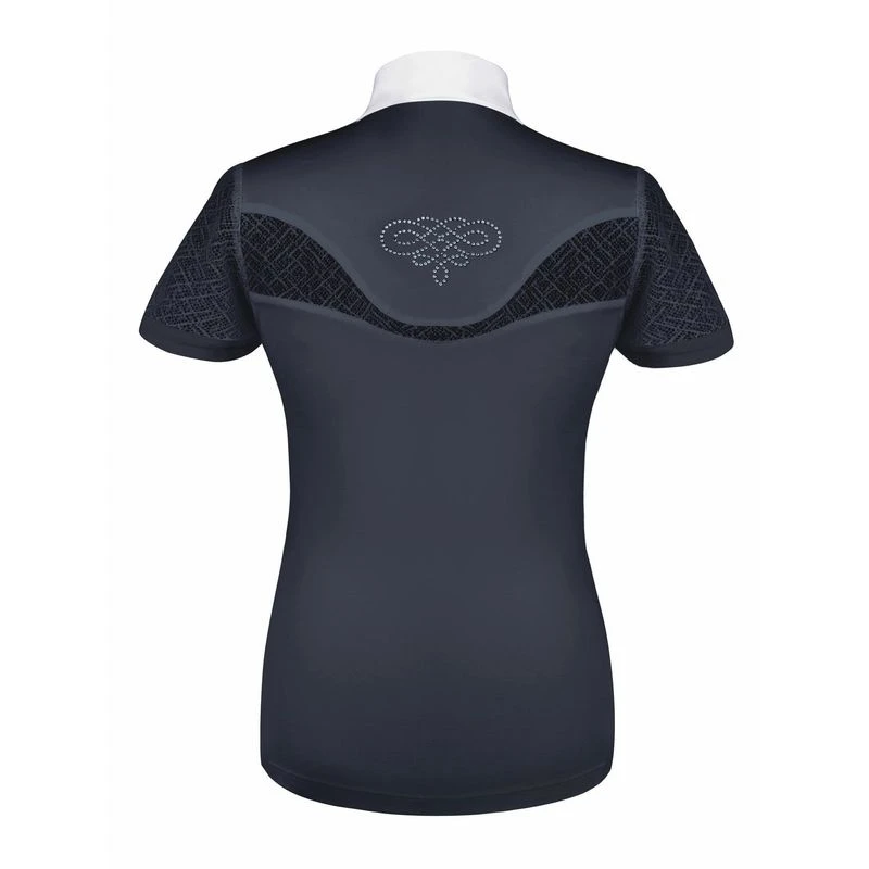 This short sleeve competition shirt is made of stretchy, breathable, and moisture wicking technical fabric. The sleeves and back inserts are mesh for increased airflow. The tab collar and placket are secured with decorative buttons and the back features a tone on tone design.