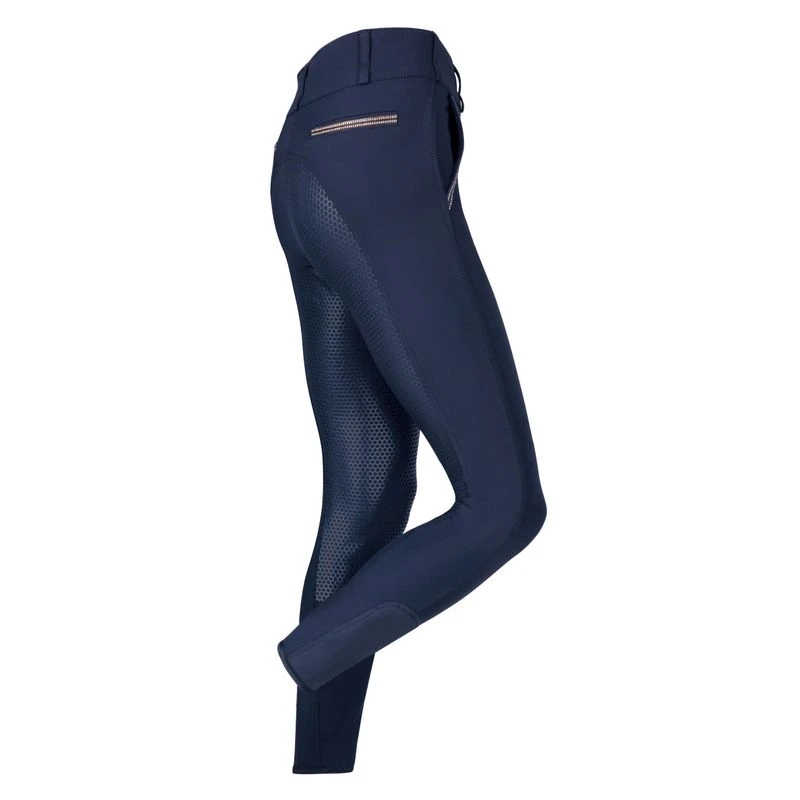 This breech features a wide double closure waistband and slash pockets. The pockets have decorative jewelry tape. The full seat is made with comfistick technology grip and the leg bottoms ar elastic.