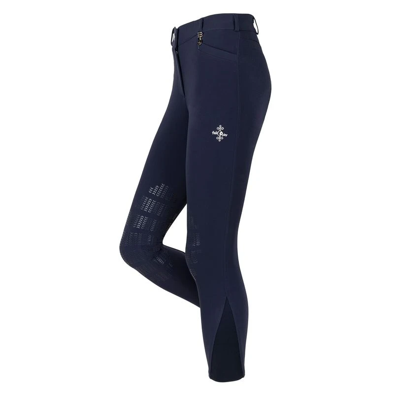 These mid rise breeches have a classic cut with slash front pockets and comfistick silicon knee patches. The fabric is a comfortable four way stretch, and the elastic leg bottoms slide easily into your tall boots. The back V shaped yoke and Euro seaming create a streamline flattering back view.