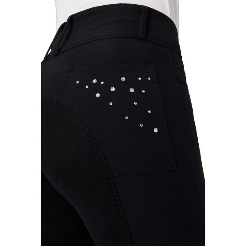 These high waisted breeches are equipped with a leather full seat. They are designed in muted colors to easily match your riding wardrobe. Crystals on the back pockets bring a touch of bling to your outfit.