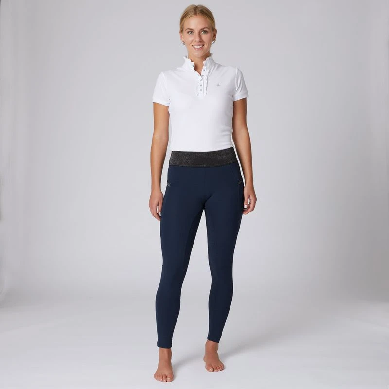 These full seat riding tights are equipped with everything you need to stay comfortable while riding: An elastic waist on breathable material with a silicone full seat. Front pockets and a zip mobile pocket in the back keep your belongings safe. A monogram print brings a touch of luxury to these affordable leggings.