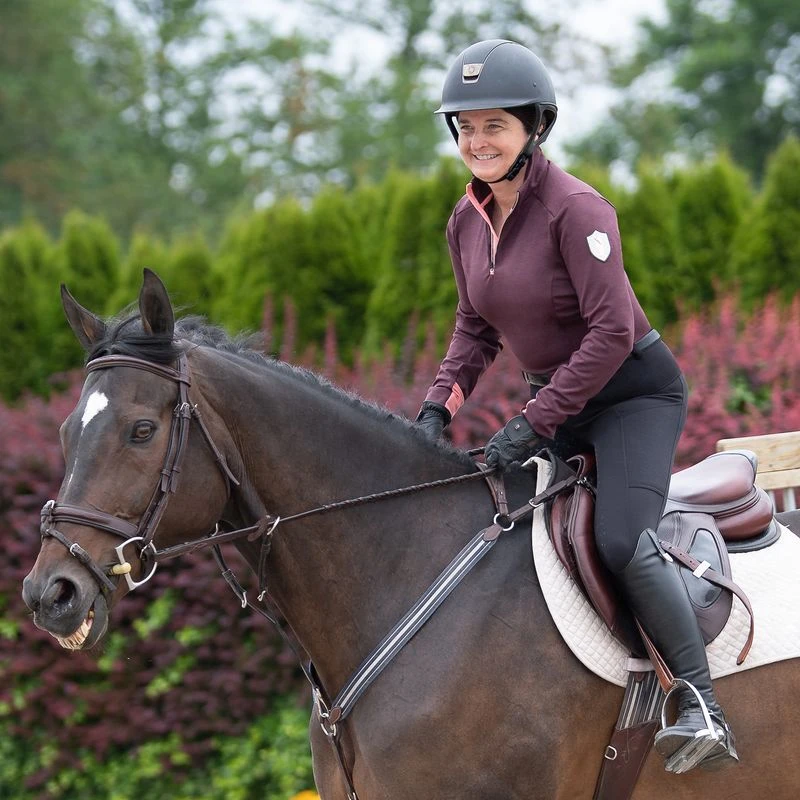 The Radiant Half Zip offers a rose gold zipper that makes getting it on and off over helmets a breeze. It features a high zip collar, soft sleeve cuffs with thumbholes that keep the cold air out, and a rose gold horsehead crest on the sleeve that adds a bit of bling. A perfect fall and winter wardrobe staple!