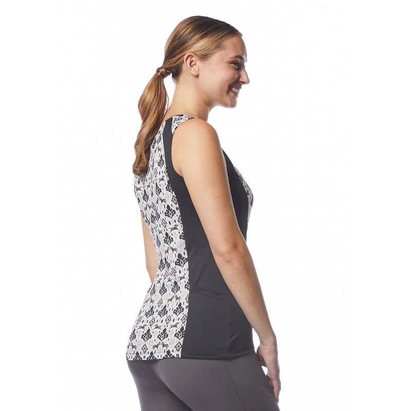 Contrast solid color panels create a flattering silhouette highlighting fun prints and a semi-fitted cut. Wider shoulder straps cover bra straps. Two side pockets hold twice as many sugars.